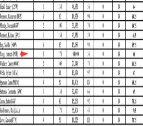 杨瀚森的加权得分是66(分越低排名越高,东契奇是1.75),在他后一位是雷霆的卡森-华莱士,在他前一位是鹈鹕的萨迪克-贝。