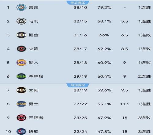 目前为止,火箭以28胜17负排名西部第四,仅领先第五的湖人(28-18)0.5个胜场,领先第六的森林狼(29-19)和第七的太阳(28-19)1个胜场,正面临着掉出季后赛区域的危险。