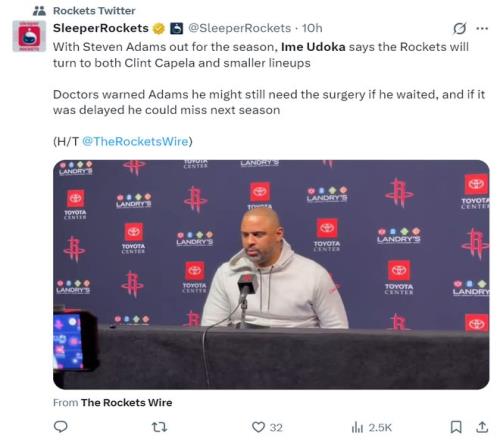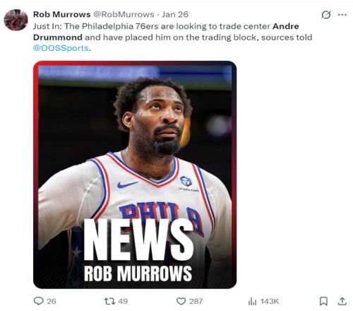 赛后根据美记Rob Murrows的报道,联盟有消息人士透露,因为亚当斯左脚踝手术赛季报销,火箭队已经开始探索交易安德烈-德拉蒙德,休斯顿对庄神非常感兴趣。